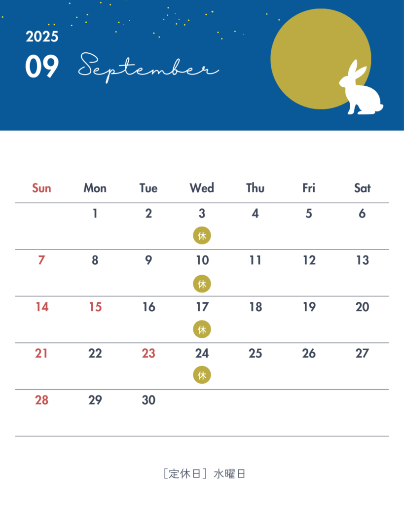 ※毎週水曜日が定休日、祝日の場合は、水曜日に営業して、翌日が定休日になります。